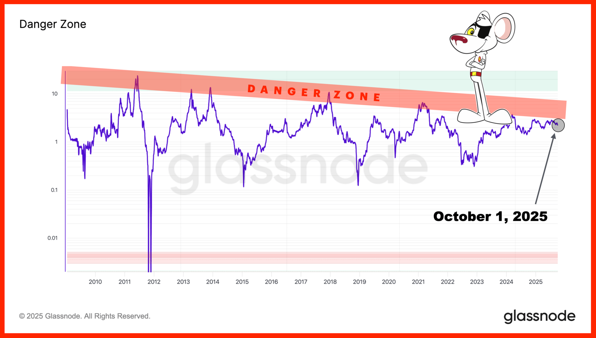 The chart imputes several metrics related to behavior and price. The danger zone trends downward because Bitcoin's price has traded in a narrower range as its market cap has grown. As a result, the metric becomes less extreme with each year.