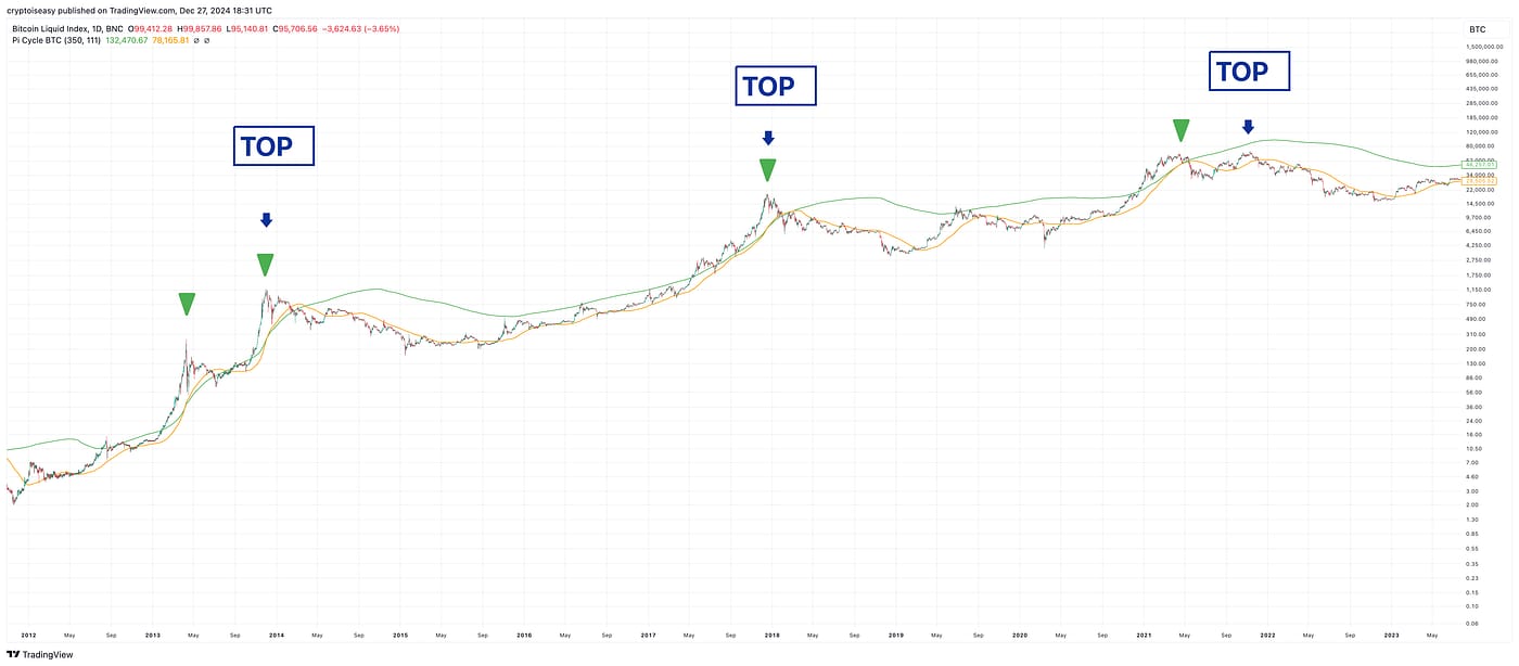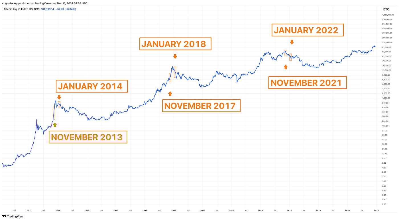 Bitcoin’s price goes up and down by 50% during peaks and bottoms. You can follow the four-year cycle and still underperform the market or anybody who follows my plan.