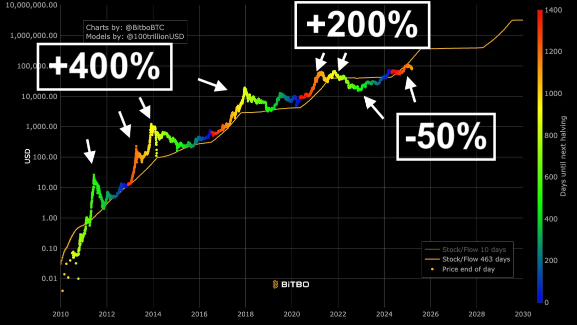 As of today, the next peak could be as high as $400,000 — unless we already hit our peak at $109,000, which is also within the model’s accuracy range (and, coincidentally, an exact touch of the S2F line in January).