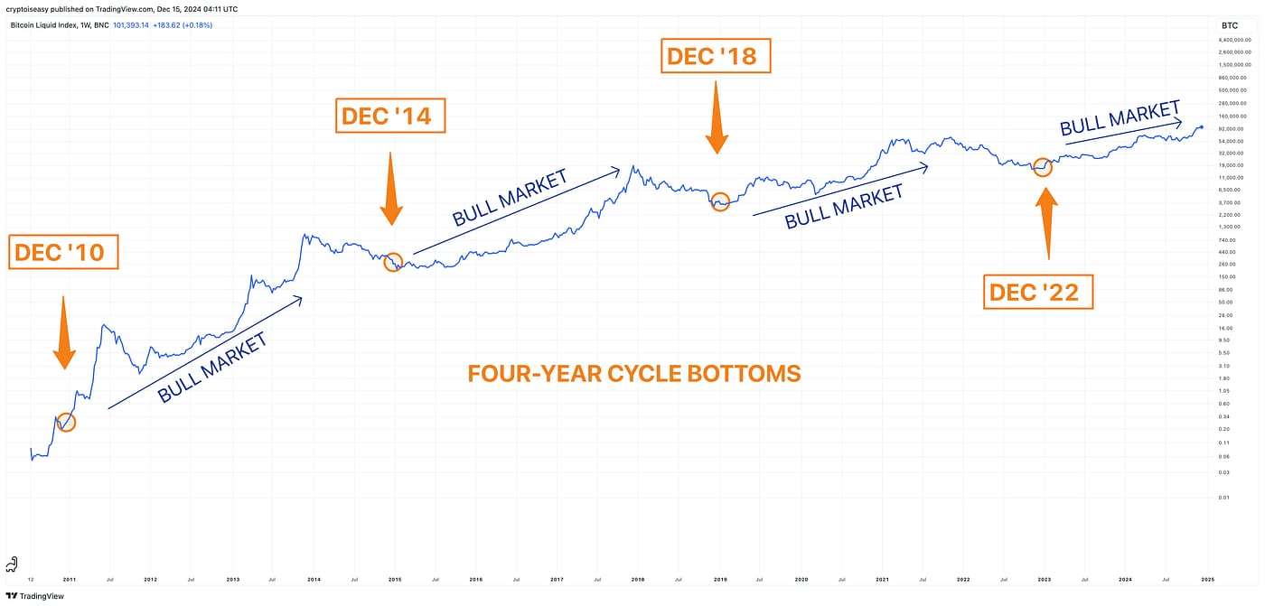 The most well-known variation probably comes from Bob Loukas, where the bottoms come in December every four years, starting with 2010. From there, we get a bull market that lasts approximately three years. Like so: